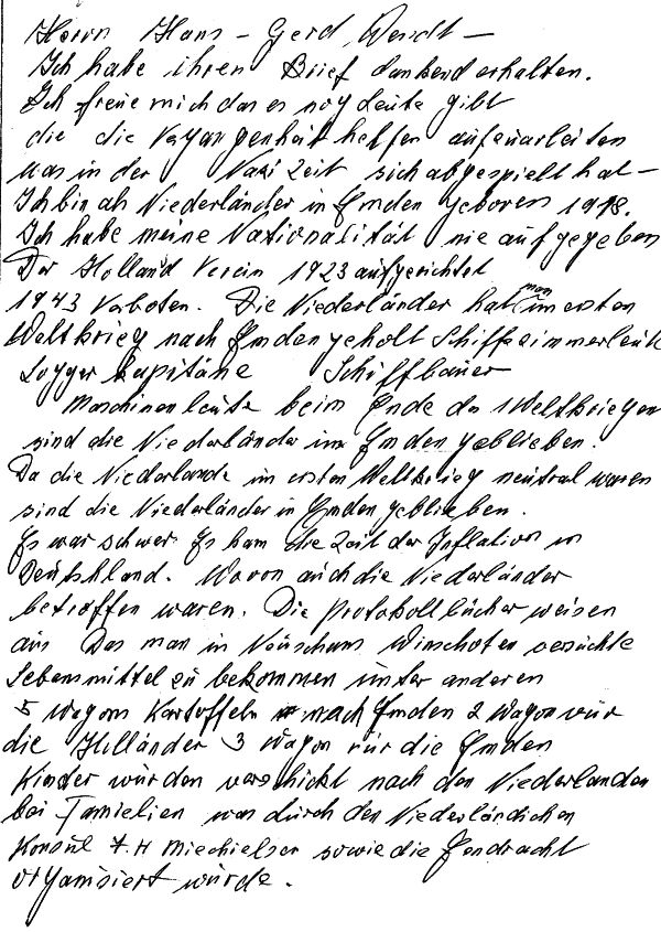 Vorbemerkung: Ich fragte seinerzeit auf einen Hinweis eines anderen Zeitzeugen bei Herrn Kruizinga nach, ob er vielleicht weitere Informationen über die Zeit des Faschismus und den Widerstand in Emden hätte. Darauf erhielt ich die folgende (handschriftliche/ in Klammern gesetzte Wörter sind nach dem Sinn ergänzt) Antwort.