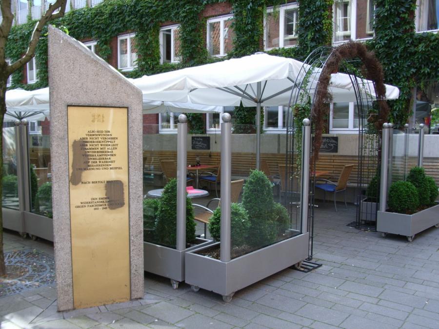 Vor einiger Zeit befand sich das Denkmal für den Widerstand an der Ecke des Biergartens. Inzwischen hat sich der Biergarten etwas zurückgezogen. Wollen wir hoffen, dass es so bleibt und dass sich das Gedächtnis der Emder auch auf diesen Teil ihrer Vergangenheit erweitert.